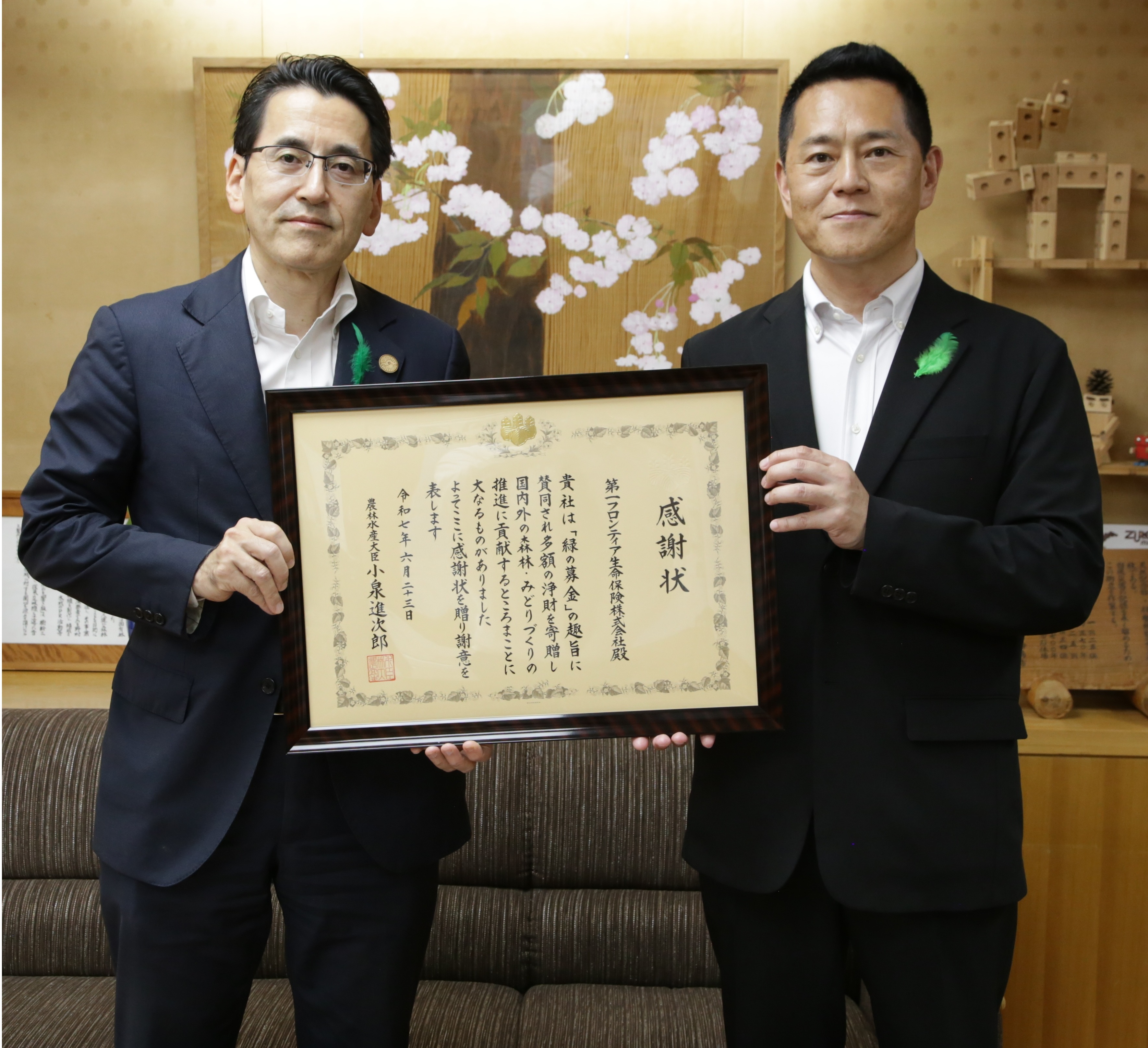 当社は、ご契約者さまにお送りしている通知物について、従来の書面に代えてインターネット上での閲覧を選択いただいた場合、ご契約1件につき300円を「緑の募金」(公益社団法人 国土緑化推進機構)へ寄付しています。2025年3月末時点で、寄付金額は1,471万円となりました。また本取組みに対し、国内外の森林づくりにつながり、さまざまな「森づくり・人づくり」活動の活性化に貢献したとして、農林水産大臣より感謝状をいただきました。