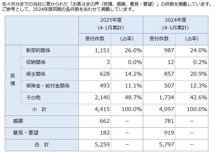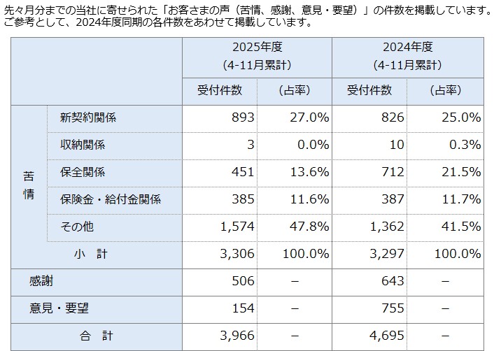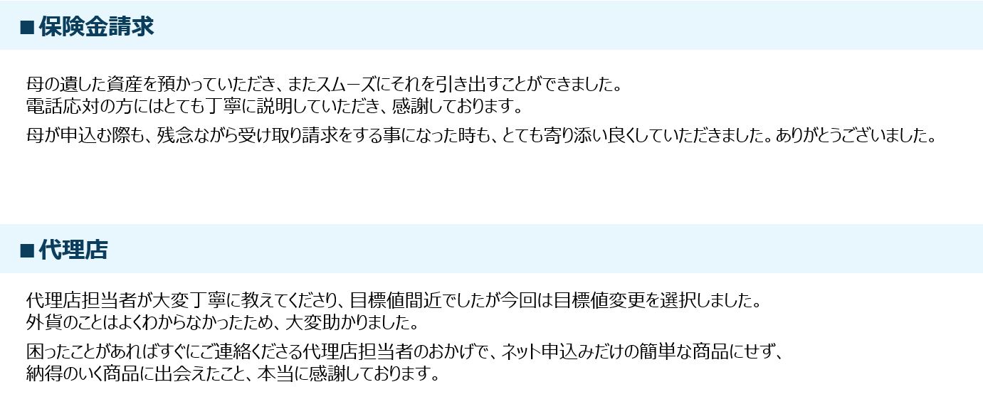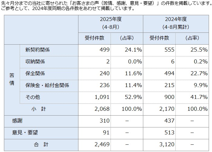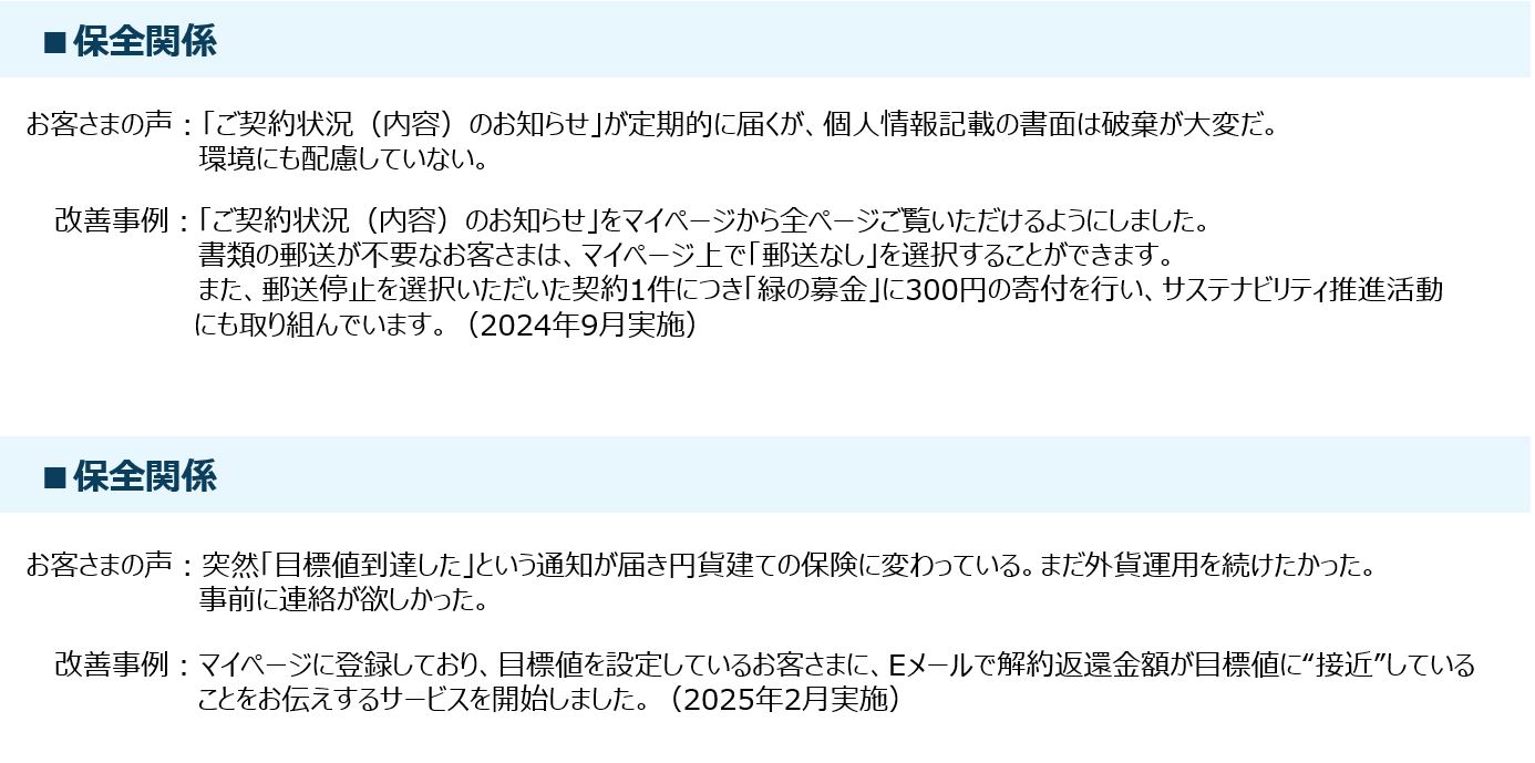 当社は、寄せられたお客さまの声に対して受付次第速やかに対応し、事実関係の確認も含め最優先に取り組みます。ご契約のあらゆる場面(「ご契約時」、「ご契約期間中」、「年金等お支払時」)でいただいた「お客さまの声」にお応えし、お客さまに最も支持される生命保険会社となることを目指しています。 当社に寄せられた「お客さまの声(苦情、感謝、意見・要望)の状況」 お客さまの声の状況 過去一覧 「お客さまの声(苦情、感謝、意見・要望)」の定義 「苦情」については、当社が取り扱う生命保険についての販売、商品(約款・販売基準等を含む)、事務制度、保全、保険金等のお支払い、その他の業務に係るお客さま(匿名者を含む)からの不満足の表明等と定義しています。「感謝」は営業活動、電話等での従業員応対や事務手続き等に関して、お客さまからのお礼や感謝、喜ばれた事例です。「意見・要望」は当社の業務改善に資する申出としています。 「お客さまの声(苦情)」の分類 新契約関係 加入時の説明に関するご不満など 募集行為に関するご不満など 収納関係 保険料のお払い込みに関するご不満など 保全関係 名義変更など各種変更手続きに関するご不満など 解約手続きに関するご不満など 保険金・給付金関係 死亡給付金、死亡保険金の支払手続きに関するご不満など 年金の支払手続きに関するご不満など その他 アフターサービスや電話・窓口応対などに関するご不満など 上記以外のご不満など お客さまの声から実現した改善事例 お客さまの声をお聞きし、さまざまな改善に取り組んでいます。 改善事例一覧 お客さまの声からの感謝の声 感謝の声一覧