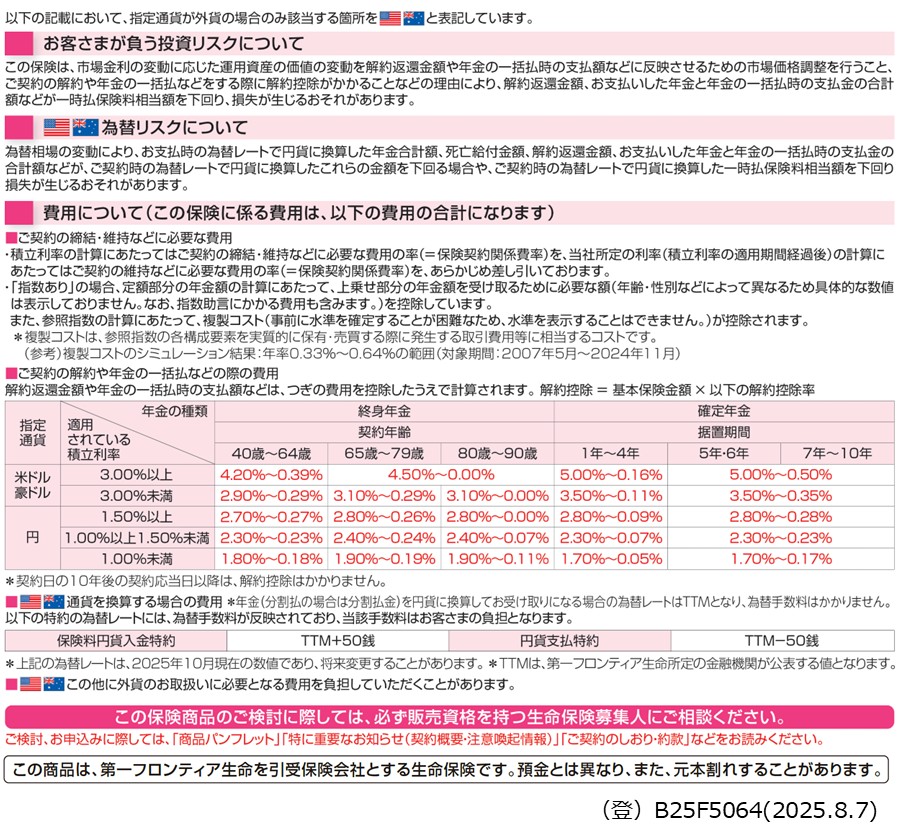 【代理店】 野村證券 第一フロンティア定額年金(円建/外貨建) 通貨指定型個人年金保険(24) 商品のデータを見る 積立利率(推移も見ることができます。) 参照指数 レポートをみる 参照指数についてのお知らせ 商品パンフレットをみる 電子パンフレット PDFをダウンロード ご確認いただきたい書類 特に重要なお知らせ(契約概要・注意喚起情報) ご契約のしおり・約款 ご注意事項